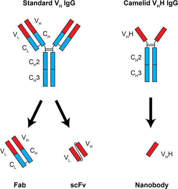 IgG variants and their derivatives. Standard IgG structures contain both heavy and light chains. Variable regions from both chains must be combined for use as an Fab fragment or for recombinant expression as a linked scFv. The camelid V H H IgG variant has only heavy chains. The single variable region can be cloned and expressed independently as a nanobody.