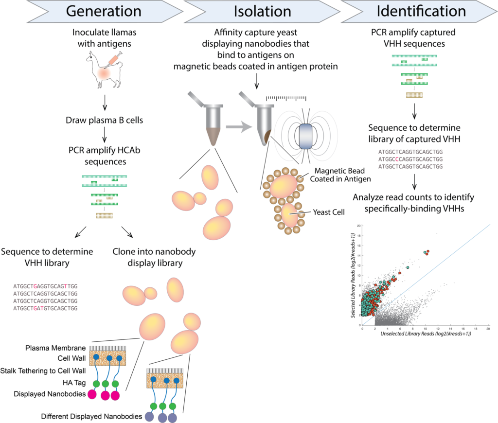 We have developed and optimized a new technology, termed Nanobody Seq/MS, which combines deep sequencing with mass spectrometry to rapidly generate large numbers of bacterially-expressed nanobodies with extremely high affinity and specificity. In our nanobody development pipeline, we first immunize llamas with the antigen target. After a strong immune response is elicited, we collect lymphocytes from bone marrow, highly enriched for active B cells. We then isolate cDNA from these cells, and perform high-throughput sequencing on the PCR-amplified variable region (VHH) of heavy-chain-only IgG variants (HCAbs). In parallel, we collect animal sera, and affinity purify HCAbs with strong affinity and specificity to each antigen. The purified HCAbs are then analyzed by MS, and by correlating peptides to the DNA database of full-length sequences, we can identify candidate nanobody clones. We also now utilize a newly-modified orthogonal and complementary approach, based on yeast surface display, to expand our nanobody repertoires.