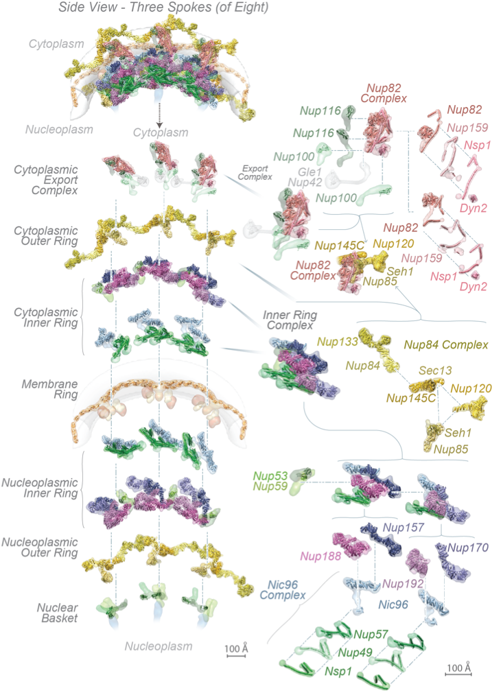 These Nups assemble into sub-complexes that form higher-order structures called spokes. Eight spokes assemble into even larger, discrete and relatively rigid modules: coaxial outer and inner rings form a symmetric core scaffold at the heart of which are sturdy diagonal columns. This scaffold is connected to a membrane ring and two peripheral assemblies, a nuclear basket and a cytoplasmic RNP export platform, all of which are. Remarkably, flexible connectors run the entire length of each spoke, tying together every major element in the NPC.